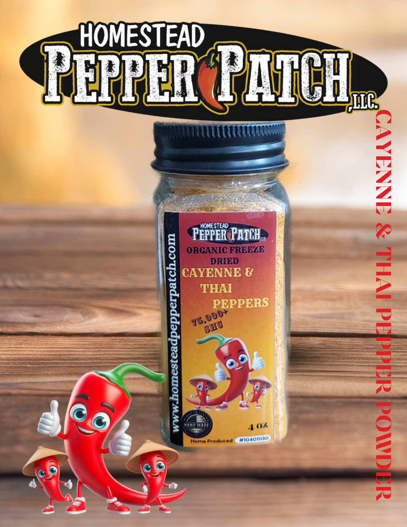 - Our CAYENNE & THAI PEPPER POWDER is a blend of our Organic Home-Grown Red Cayenne & Thai peppers. We harvest them at the peak of ripeness then Freeze Dry them. They are then ground into our RED Pepper Powder, with an average Scoville heat of over 75,000.